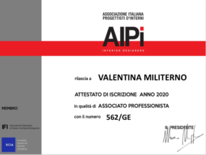 AIPi® , Associazione Italiana Progettisti in architettura d’ Interni – Industrial Desig, dopo un lungo percorso ha accreditato in qualità di associato professionista la dott.ssa Valentina Militerno founder di The LAB Project.